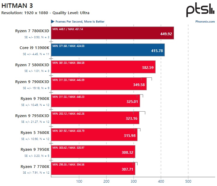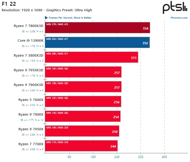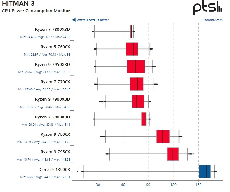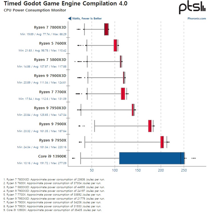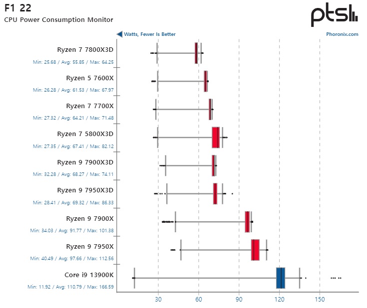 13900k의 절반도 안되는 전력을 소비하여 동일한 수치의 프레임을 뽑아낸 것이다.